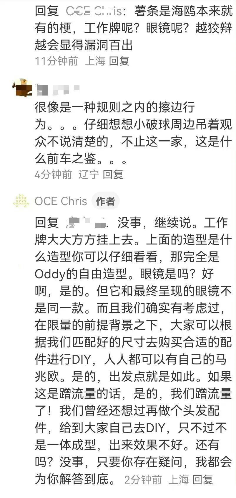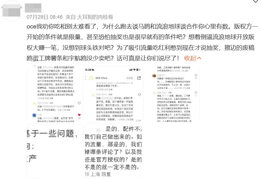 并未等来期待已久的发售价格和渠道信息,失望情绪在粉丝间蔓延。有人猜测合作未成是由于马兆鸥形象的版权归属难以界定,也有不少人认为OCE半年的铺垫属于“浪费感情”,“无法量产售卖”如此关键的信息,官方却不提前告知。
