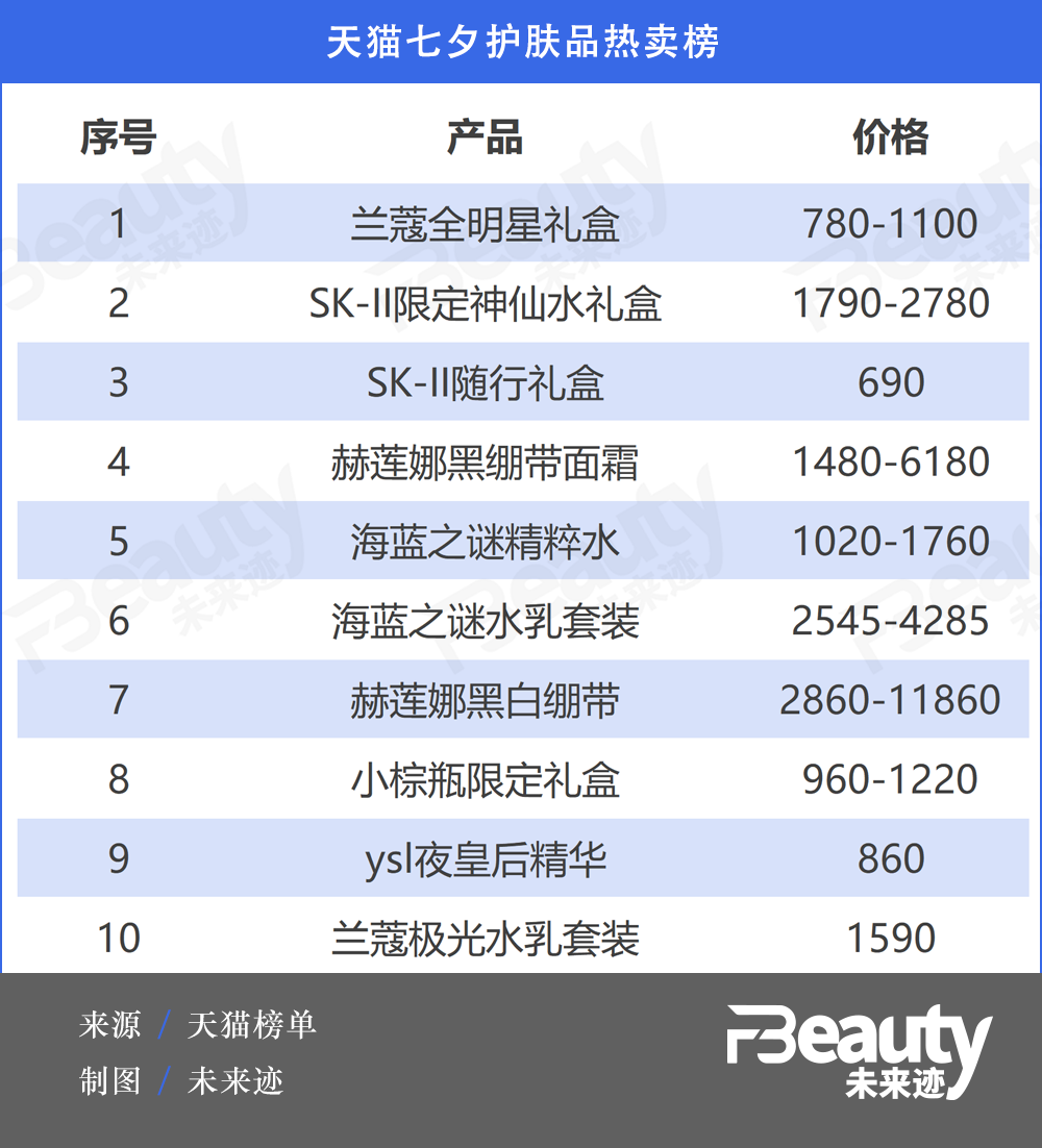 然而,在高净值用户相对集中的天猫平台里,主力消费的价格带仍然坚挺,在天猫七夕节护肤品热卖榜单TOP10中,兰蔻、SK-II、赫莲娜等国际大牌礼盒依已经站在C位。