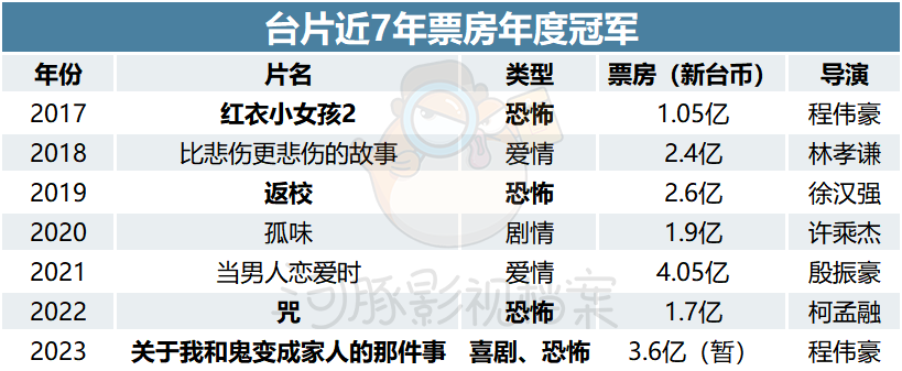事实上,《红衣小女孩2》的票房2017年突破1亿新台币之后,至今7年台片每年的冠军已经被恐怖片占据半壁江山。徐汉强、柯孟融、廖士涵等新(中)生代导演纷纷获得机会,改变了当地新导演无法出头的历史。