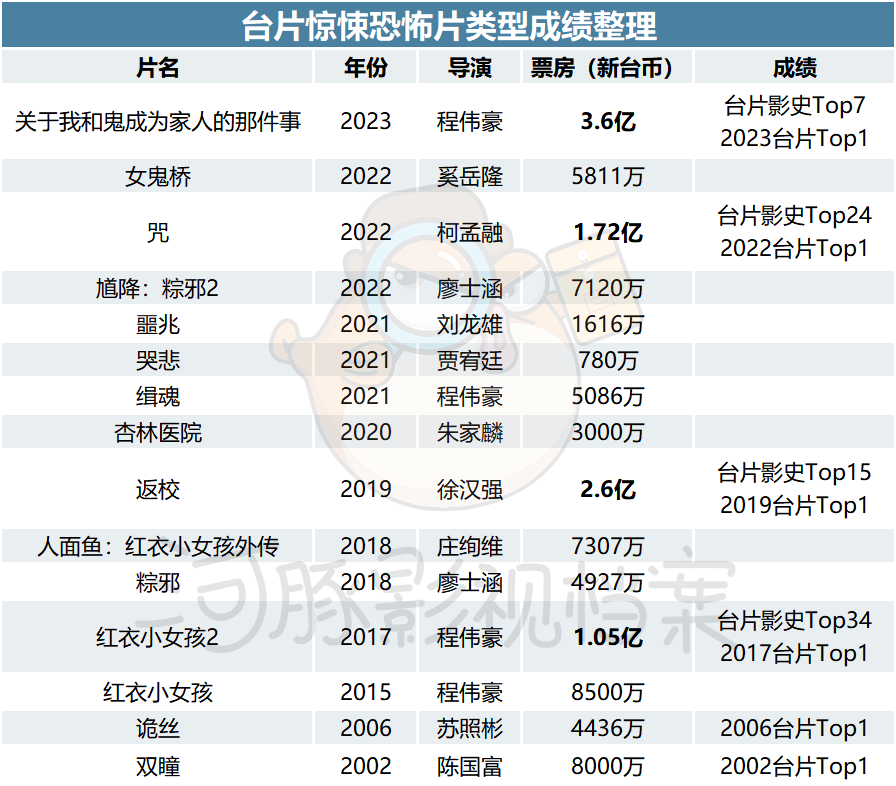 最关键的是,程伟豪系列电影的成功,让恐怖片这个在台片市场或者票房历史中基本没有姓名的类型,有了一个数量和票房的新突破。