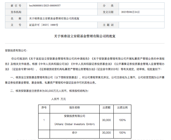 8月24日,中国证监会官网发布批复,核准设立安联基金管理有限公司(下称“安联基金”),对公司章程草案无异议。