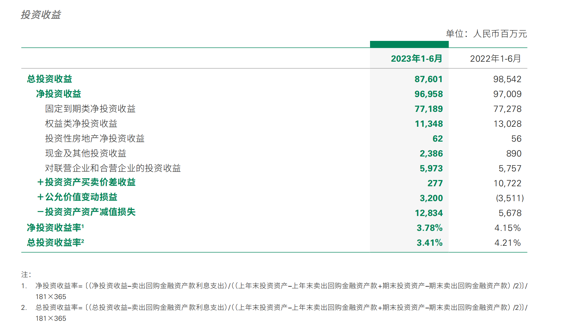 2023年上半年实现总投资收益876.01亿元,较2022年同期减少109.41亿元,公司解释主要系公开市场权益品种实现收益下降影响。报告期内,公司总投资收益率为3.41% ,较2022年同期下降80个基点。考虑当期计入其他综合收益的可供出售金融资产公允价值变动净额后,综合投资收益率为4.23% ,较2022年同期增长48个基点。