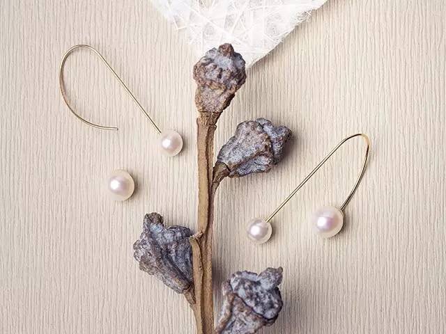 这款珍珠耳环被手工弯曲成特殊的弧度,两端各坠上一颗珍珠,小的那颗是日本Akoya珍珠,大的那颗是天然淡水珠,它相当于一个耳背,可以拆卸,戴出不同的效果。