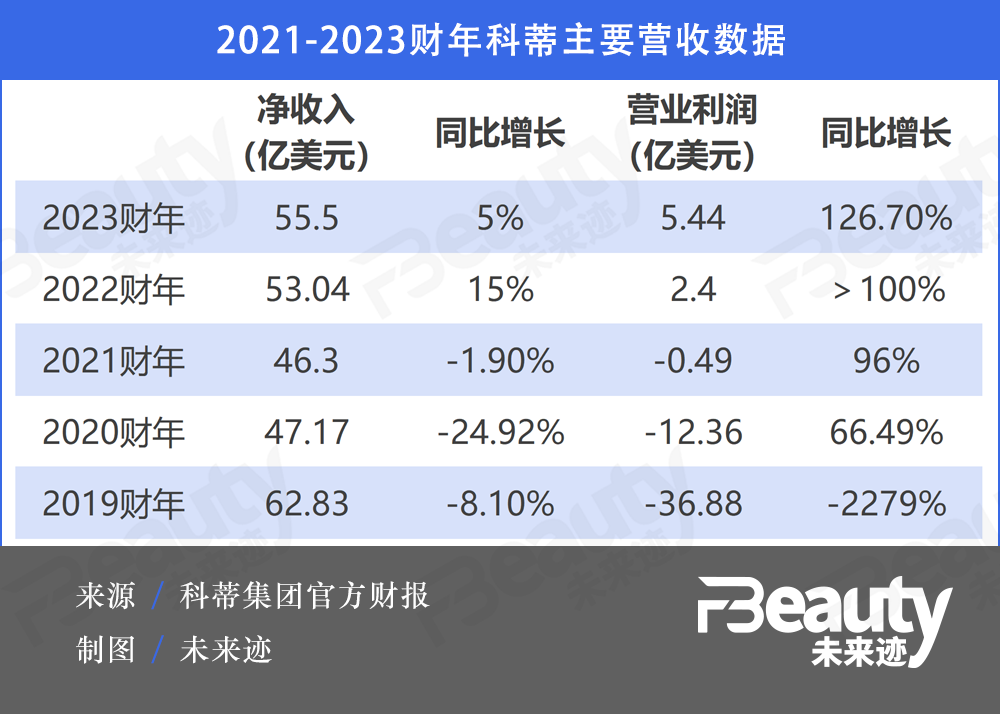 《FBeauty未来迹》梳理近五年来科蒂集团主要营收数据发现,Sue Y. Nabi的上任,不仅帮助集团“力挽狂澜”,大大扭转下滑势头,并且近三年业绩发展稳定,持续向好。