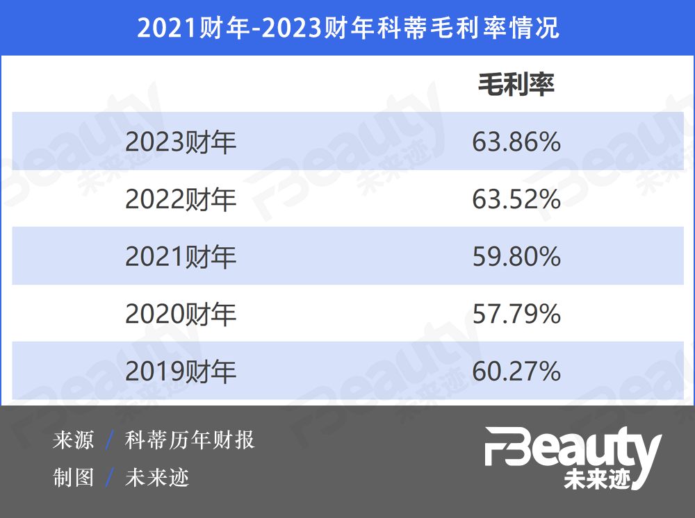 值得关注的是,《FBeauty未来迹》梳理发现,近五年科蒂集团毛利率也经历了一轮“下滑再增长”。2019-2021财年,毛利率从60.27%下滑0.47个百分点至年上升4.06个百分点。