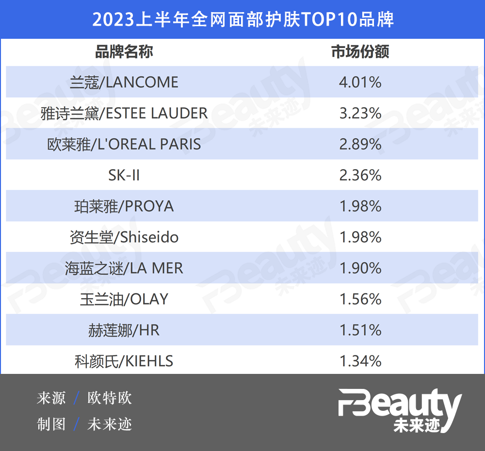 根据欧特欧数据,2023年上半年,全网面部护肤TOP10品牌面部护肤TOP10品牌被欧莱雅集团、雅诗兰黛、资生堂、宝洁旗下品牌占据。而这些头部品牌,基本已经进入中国市场多年,具有相当高的消费者积累和品牌知名度。