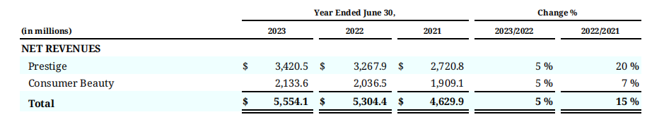 2023财年,高端美容部门净收入为34.2亿美元,消费美容部门净收入为21.34亿美元,均获得5%的同比增长。