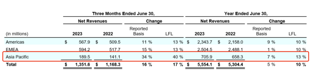 分地区来看,美洲和EMEA(欧洲、中东、非洲)仍然为集团两大主要市场。2023财年,美洲地区净收入为23.43亿美元,同比增长9%;EMEA净收入为25.04亿美元,同比增长1%。两个地区可比销售增长均为10%,净收入占比总计高达86%。