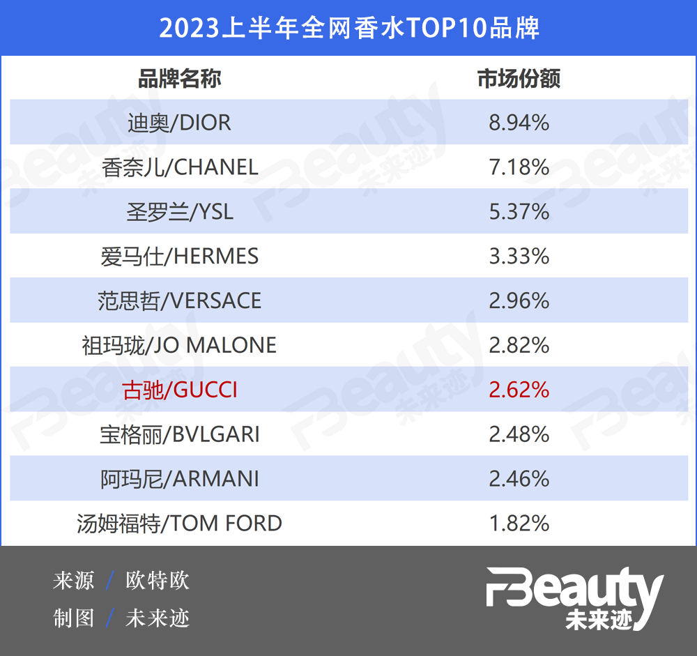 除此之外,中国市场高端香水领域之争也极其激烈。2023年上半年,全网香水TOP10品牌中,迪奥排名第一,占据8.94%的市场份额。科蒂旗下诸多香水品牌,仅古驰/GUCCI一员入榜,市占率为2.62%,位列第七。