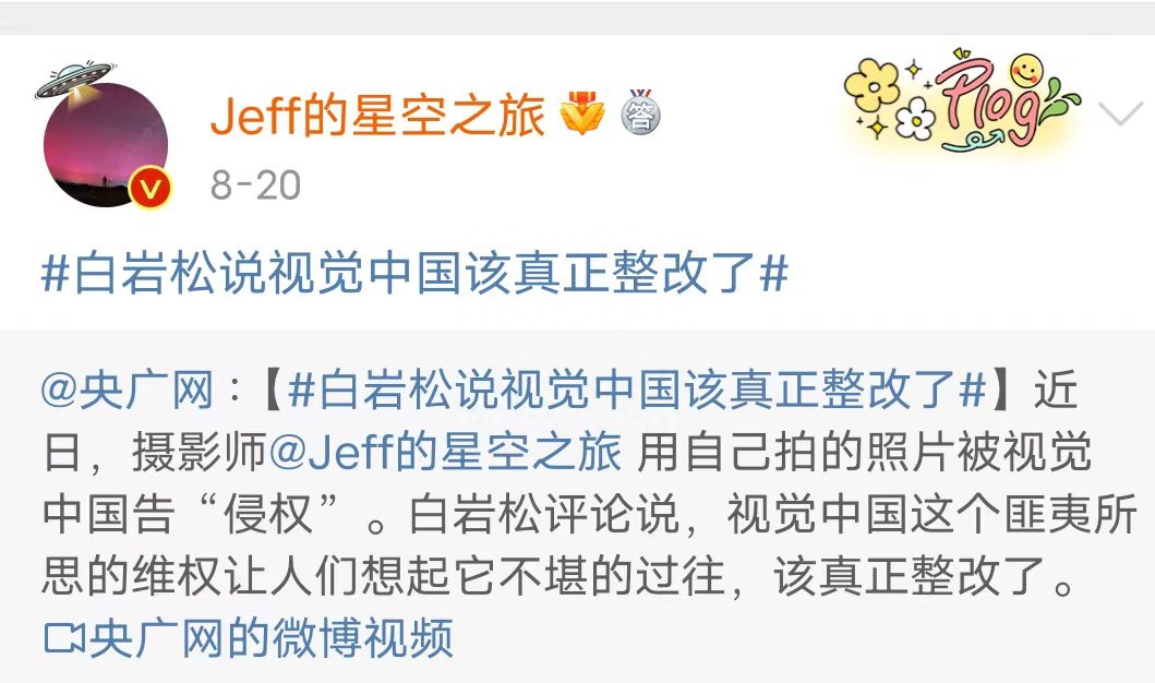 8月20日下午,摄影师戴建峰(@Jeff的星空之旅)参与社交平台上“白岩松说视觉中国该真正整改了”的话题并转发相关视频。