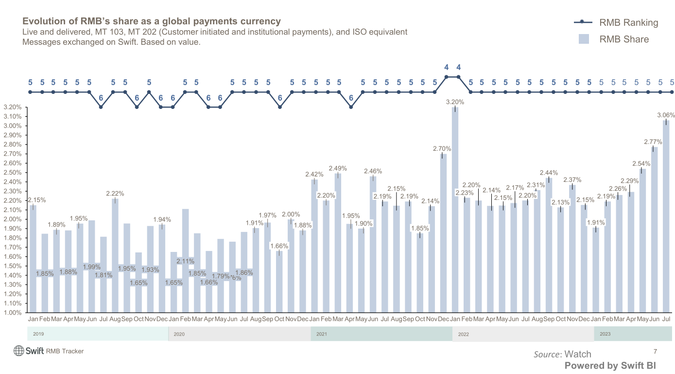 环球银行金融电讯协会(SWIFT)周三发布数据显示,7月,人民币全球支付占比为3.06%,较上月上升0.29个百分点,连续六个月上升。