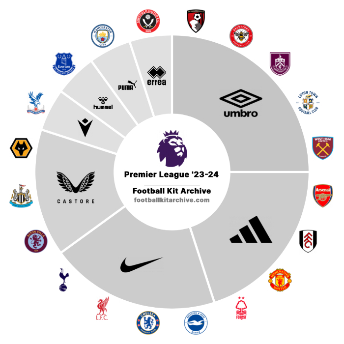 作为英国老牌本土品牌,茵宝(UMBRO)在英超争得多数赞助席位,为西汉姆联、布伦特福德等5家俱乐部提供球衣。