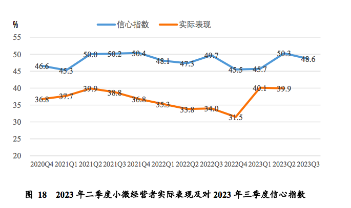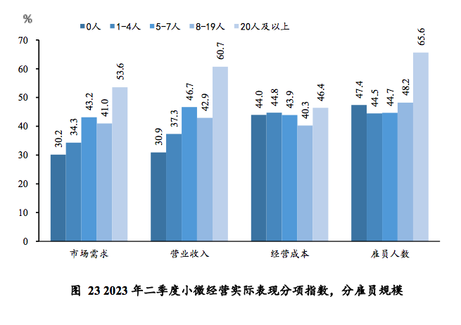 另外,调查显示,小微经营者对三季度的信心指数较上个季度回落1.7个百分点至48.6%,重回荣枯线以下。规模越小的商户对未来经营收入和市场需求的预期越低,仅有20人及以上企业在市场需求、营业收入以及雇员规模的实际表现上均明显高于荣枯线。