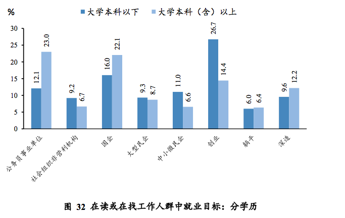 在小微经营者无意扩大雇员规模的同时,受过高等教育的劳动者更倾向于稳定的就业选择,如“公务员事业单位”以及“国企”单位。报告提到,大学本科(含)以上的在读正在找工作的人群中,明显更青睐“公务员事业单位”以及“国企”单位,选择两者为职业期待的占比之和超过四成。