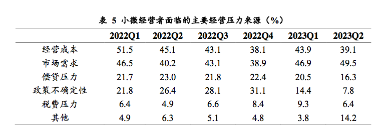 二季度小微经营者面临的成本压力整体有所下降,但反映租金和原材料成本压力的小微经营者比例有所增加。其中,反映租金成本压力的小微经营者比例从一季度的53.9升至56.1%,为去年二季度以来最高;反映原材料成本压力的小微经营者占比从一季度的42.9%升至44.5%,为去年三季度以来最高。雇工成本、公共事业费、物流成本和环保治理相关成本则出现不同程度的下降。