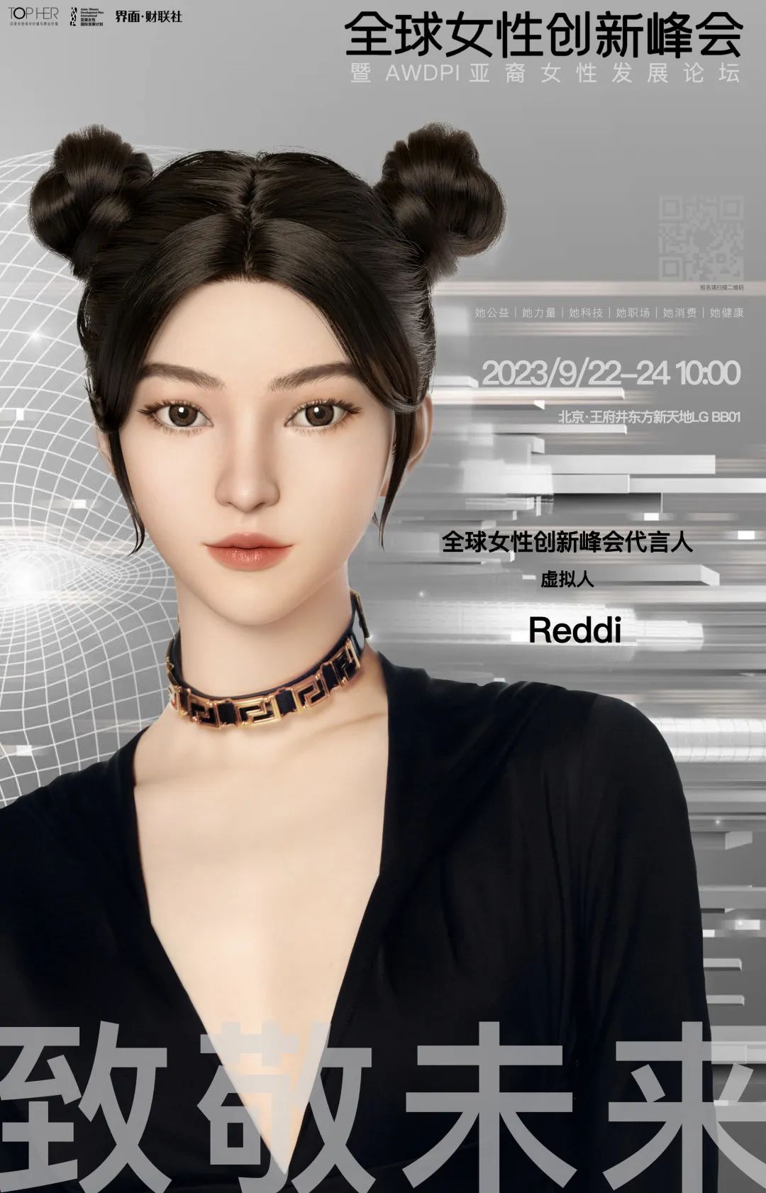 Reddi中文名为芮蒂,是一名21岁的中国超写实虚拟偶像女孩,由虚拟数字资产开发及数字内容运营商 StarHeir Technology 提供技术支持。作为新一代超写实虚拟偶像超写实博主,Reddi活跃于各类社交媒体,目前已在小红书和微博等平台拥有百万粉丝。这与本届峰会关注女性未来科技、公益、职场、教育、商业、健康等议题有着高度连接感。