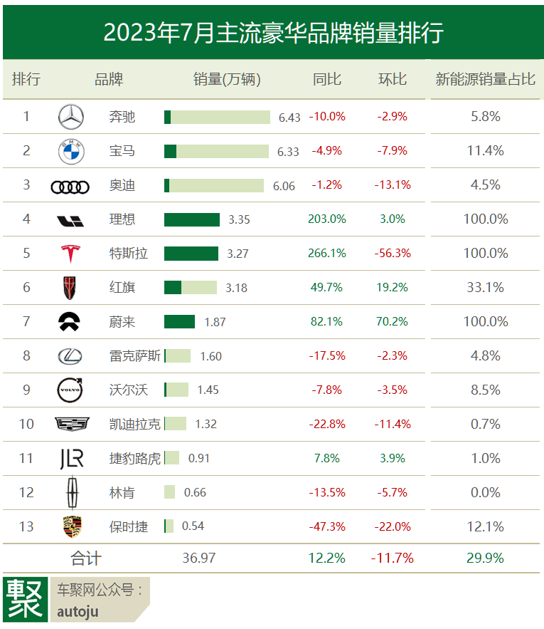 数据显示,2023年7月国内主流豪华品牌(13家,下同)共销售36.97万,同比增长12.2%,表现远好于当期乘用车整体水平——下滑0.6%。
