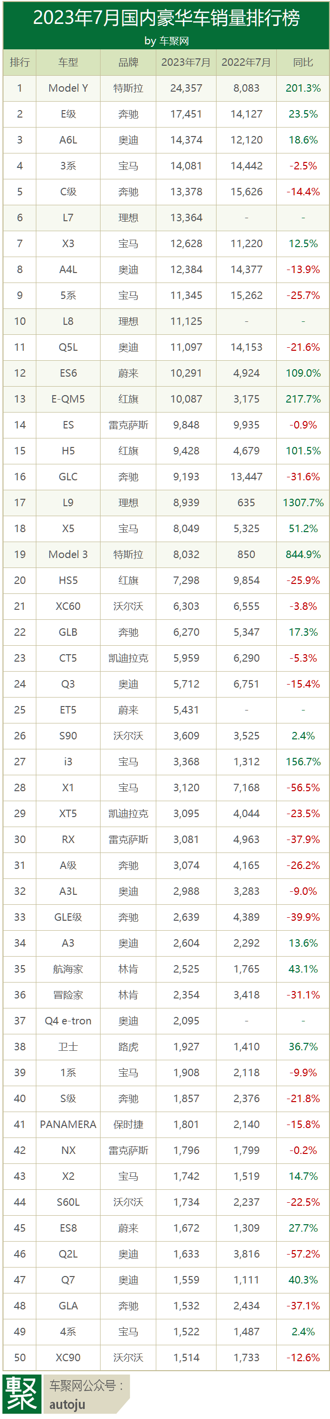 理想7月同比增长203%,以3.35万辆的销量位居榜单第四,成为二线豪华品牌领头羊。L系列产品处于销量爬坡期,令理想势头正猛。据悉,理想当季销量仍被产能制约,若不然销量或不止3万辆,将突破4万辆。
