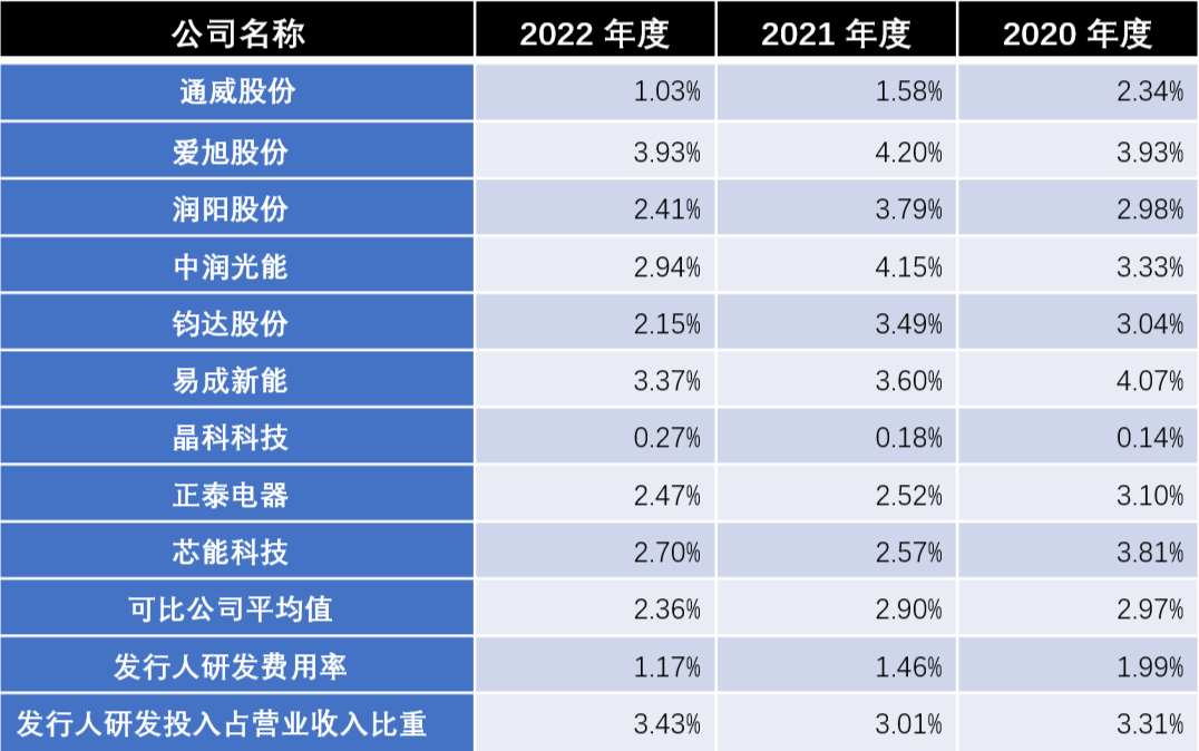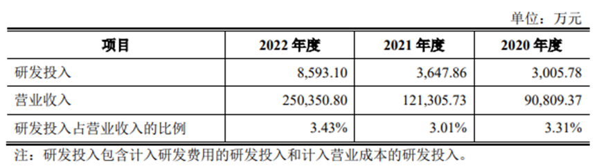 招股说明书显示,2020-2022 年,公司研发费用率为1.99%、1.46%和 1.17%,低于同行业平均水平。