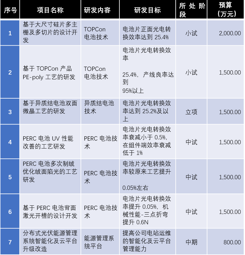 在TOPCon方面,公司“基于大尺寸硅片多主栅及多切片的设计开发”正处在小试阶段,研发目标是电池片正面光电转换效率达到25.4%。
