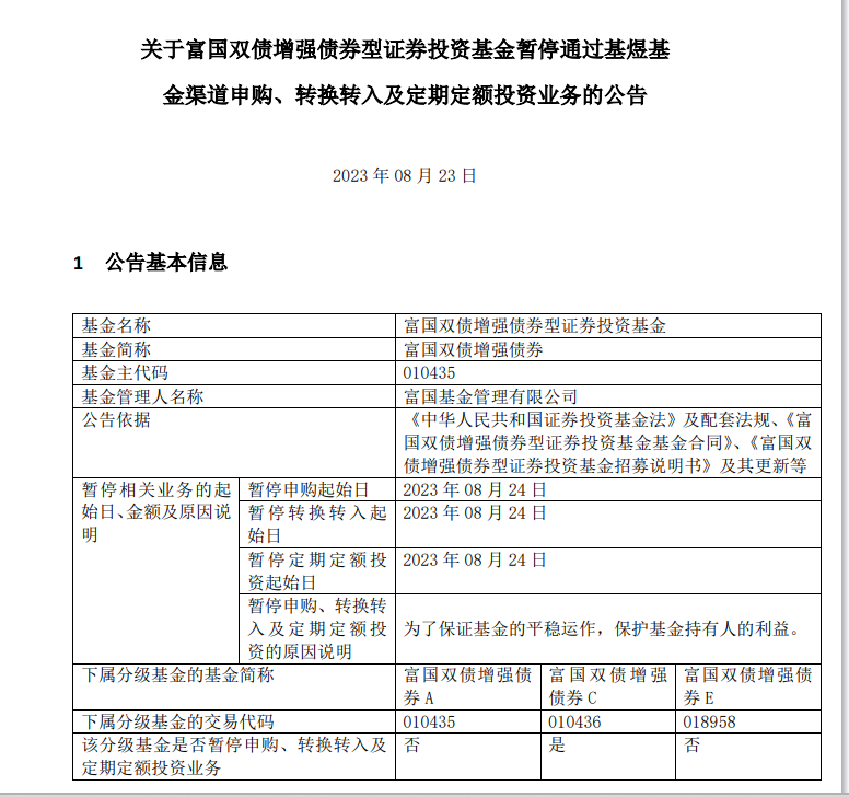 今年8月1日,富国双债增强C份额就公告,暂停通过直销机构的申购、转换转入及定期定投业务。
