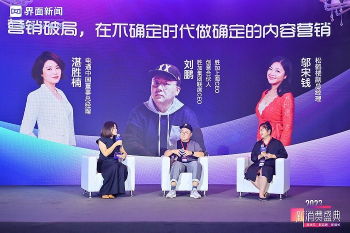 2023年8月10日,由上海报业集团|界面新闻主办的第六届【新消费盛典】于上海新天地朗廷酒店顺利举行。在圆桌对话环节,电通中国董事总经理湛胜楠,胜加集团联席CEO&创意合伙人、胜加上海CEO刘鹏,松鹤楼副总经理邬宋钱进行圆桌对话,就《营销破局,在不确定时代做确定的内容营销》展开讨论。