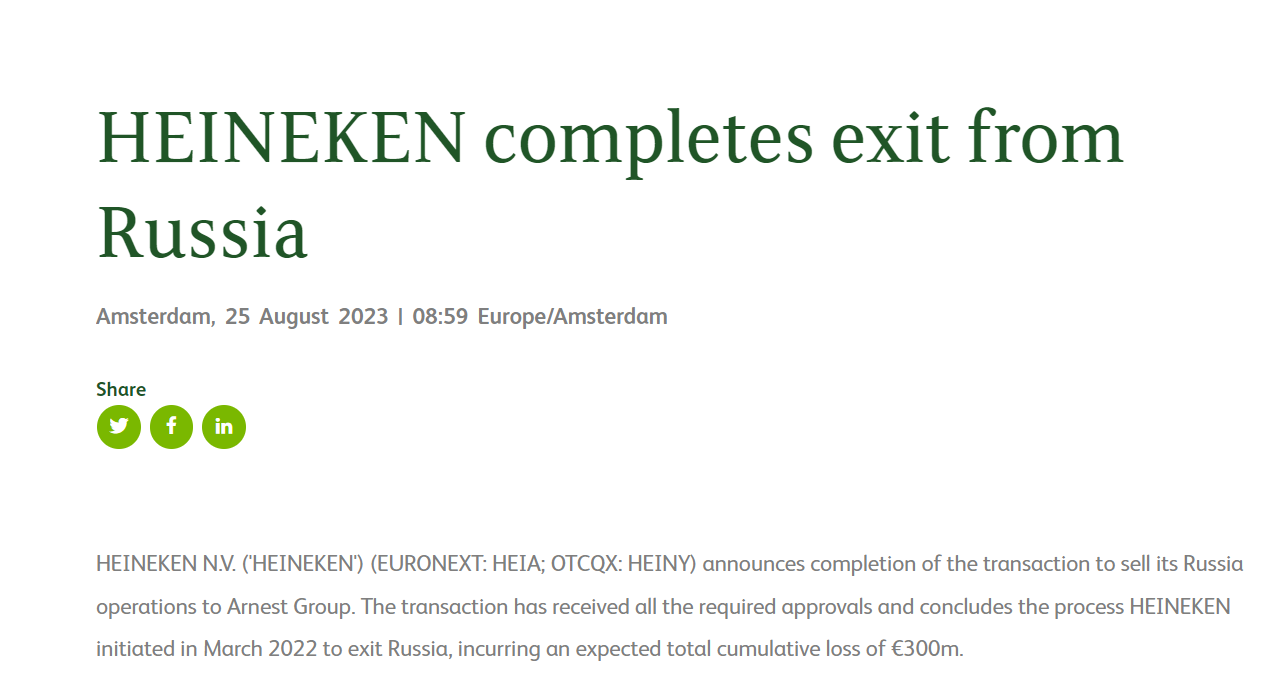 喜力8月25日发布声明,宣布正式退出俄罗斯市场。