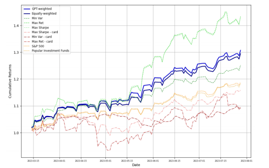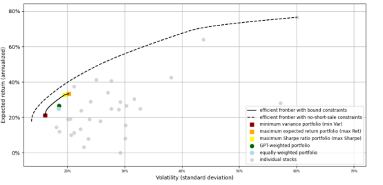 在得到了两种不同的投资组合,即一般的等权组合,和GPT-4自己选的加权组合后,研究人员会根据投资组合优化的算法,计算这两种股票组合的收益和风险。