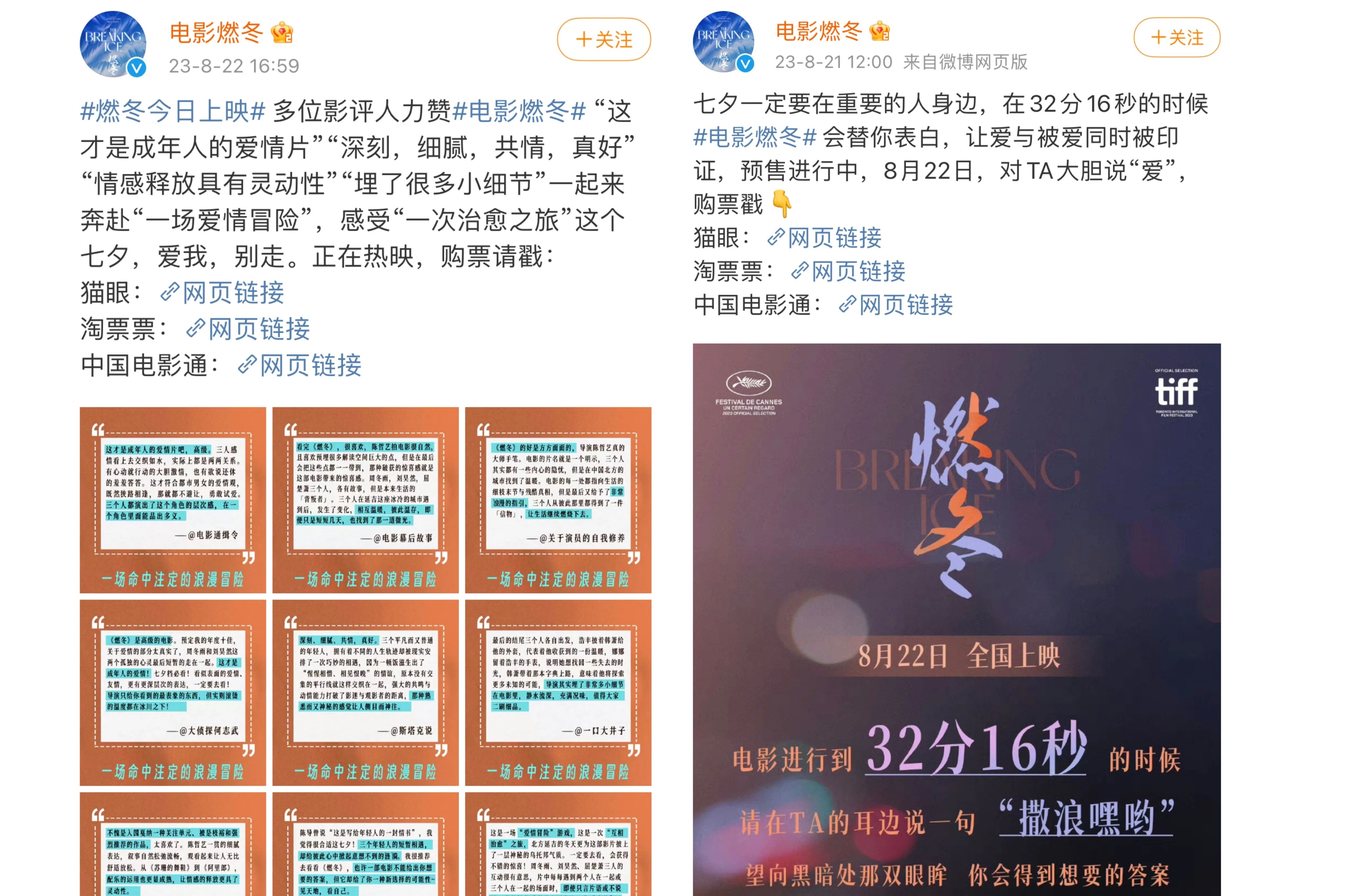 微博上,上映当天《燃冬》官方账号发博配图“好温暖、超治愈、勇敢爱”,上映前一日的海报上打出与“一吻跨年”异曲同工的宣传语“电影进行到32分16秒的时候请在TA的耳边说一句‘撒浪嘿哟’。”——《燃冬》完全践行商业爱情的宣传策略,但是这显然有悖于电影本身聚焦于青年群体迷茫的核心所在,于是,失败的营销策略让电影既无法触及到真正的目标群体,也激怒了可能的潜力观众。