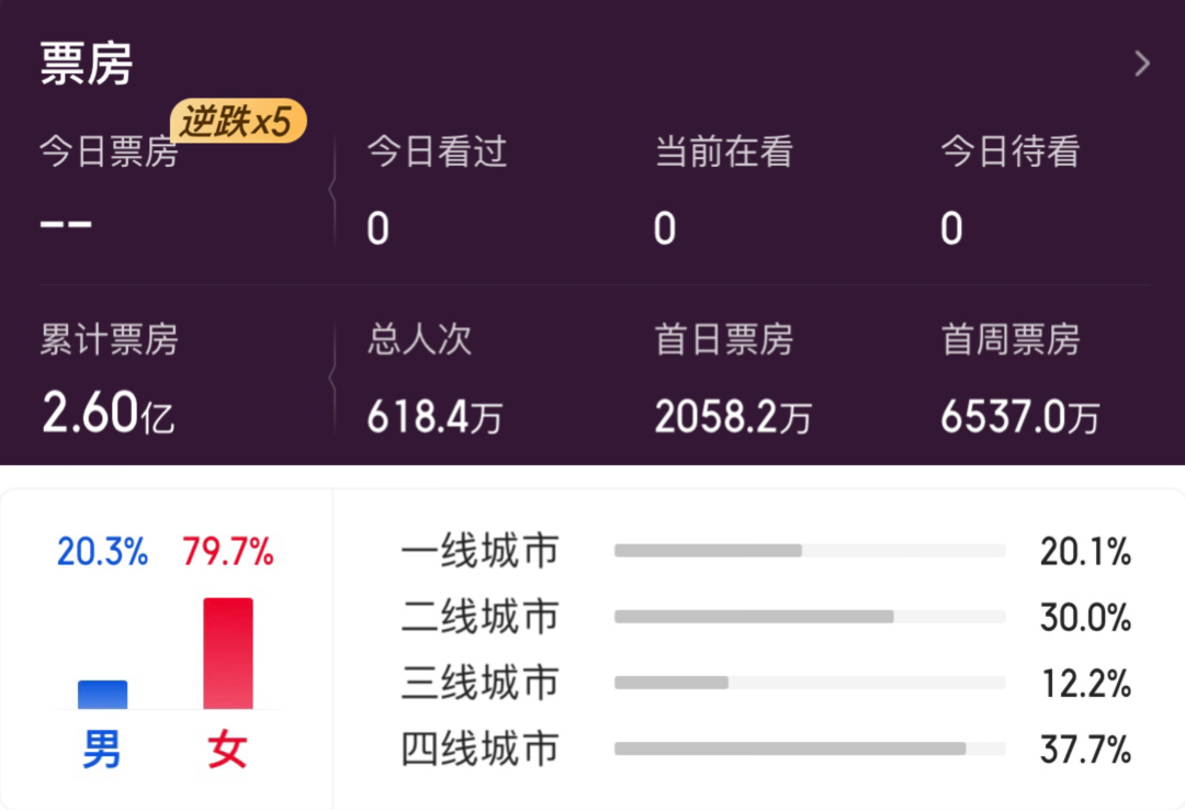 最终,《爱情神话》数次逆跌,拿下2.6亿票房,值得注意的是,文艺片难以触及的四线城市,居然占到了《爱情神话》票房的37.7%。