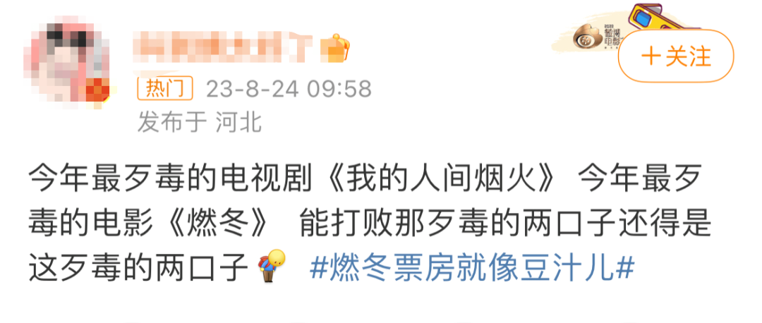 意外的是,映后一切期待都落了空。8月24日,“燃冬票房就像豆汁儿”登上微博热搜榜,话题里网友大多是对《燃冬》的不满。不仅如此,小红书、豆瓣、抖音、B站等其它社交媒体平台上,网友们大范围玩梗调侃称:“2023最歹毒电视剧《我的人间烟火》,2023最歹毒的电影《燃冬》”。