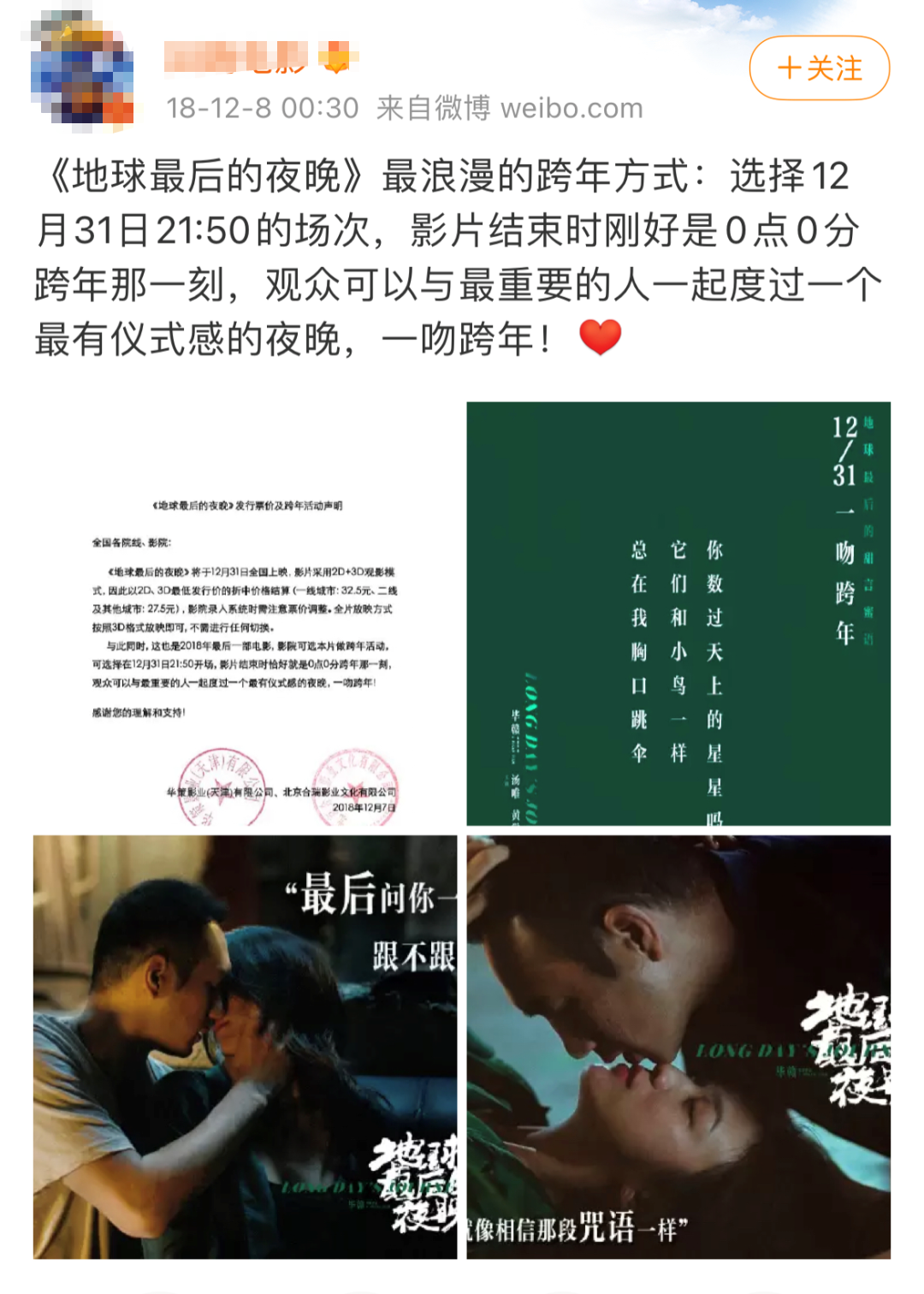 2018年,跨年夜《地球最后的夜晚》首映,凭借宣传“一吻跨年”的独特概念吸引了不少观众,当时适逢短视频上升期,“一吻跨年”在抖音迅速走红,最后,电影形成一票难求的盛景,预售票房1.5亿,首日票房便达到了2.5亿。