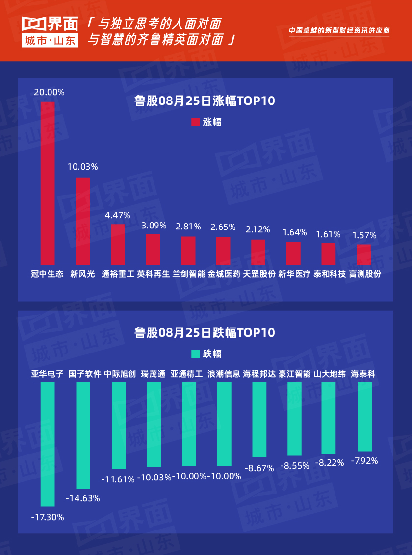 8月25日,山东49只个股上涨,6股持平,250只下跌。