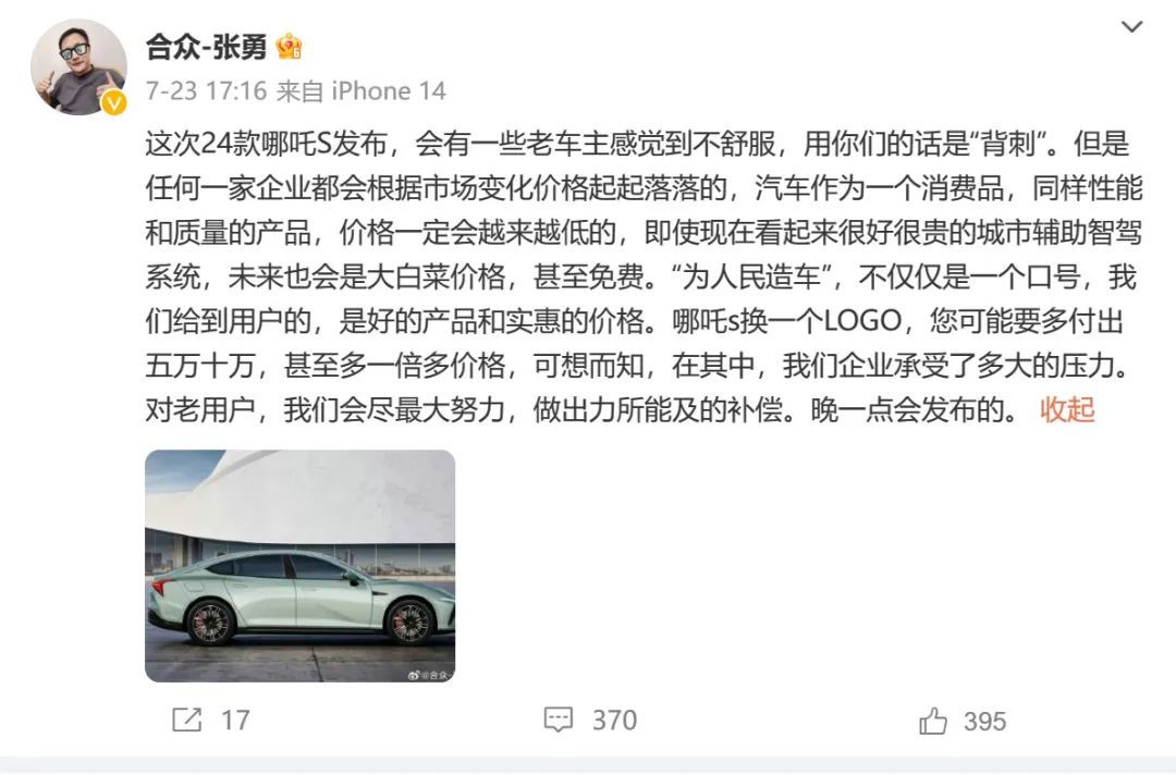7月20日,由于新上市的2024款哪吒S“增配降价”,哪吒汽车也被老车型车主控诉为“背刺老用户”。舆论发酵之后,哪吒CEO张勇回复称,汽车作为消费品,同样性能和质量,价格一定会越来越低,但对老用户会尽力补偿。