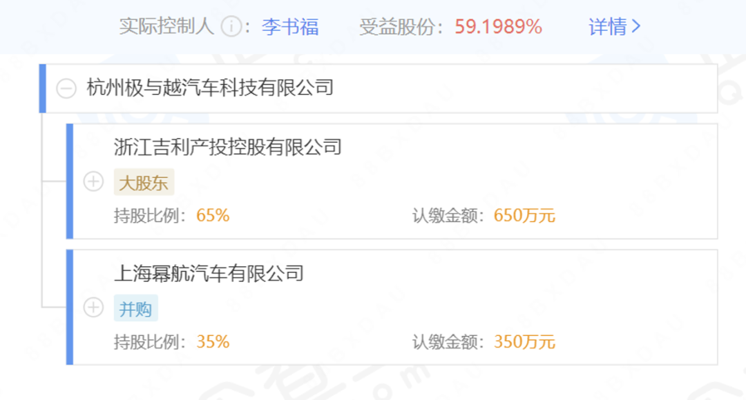据企查查显示,极越品牌的运营主体是杭州极与越汽车科技有限公司,由百度旗下上海幂航汽车有限公司和浙江吉利产投控股有限公司共同持股,双方持股比例为35%和65%。