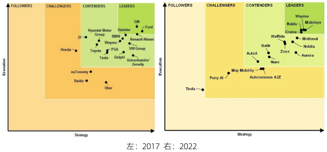 值得注意的是,百度的排名经历了一个爬坡的过程。以Navigant Research的榜单为例,在2017年,百度被列在“挑战者”分类中,2019年升至“竞争者”,2022年升至“领导者”。