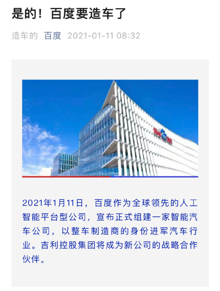 2021年1月11日,百度官宣造车,正式组建一家智能汽车公司,以整车制造商的身份进军汽车行业,吉利控股集团彼时为新公司的战略合作伙伴。消息披露后,百度美股股价大涨,市值重回800亿美元,股价大涨的原因在于市场看好百度的技术储备。