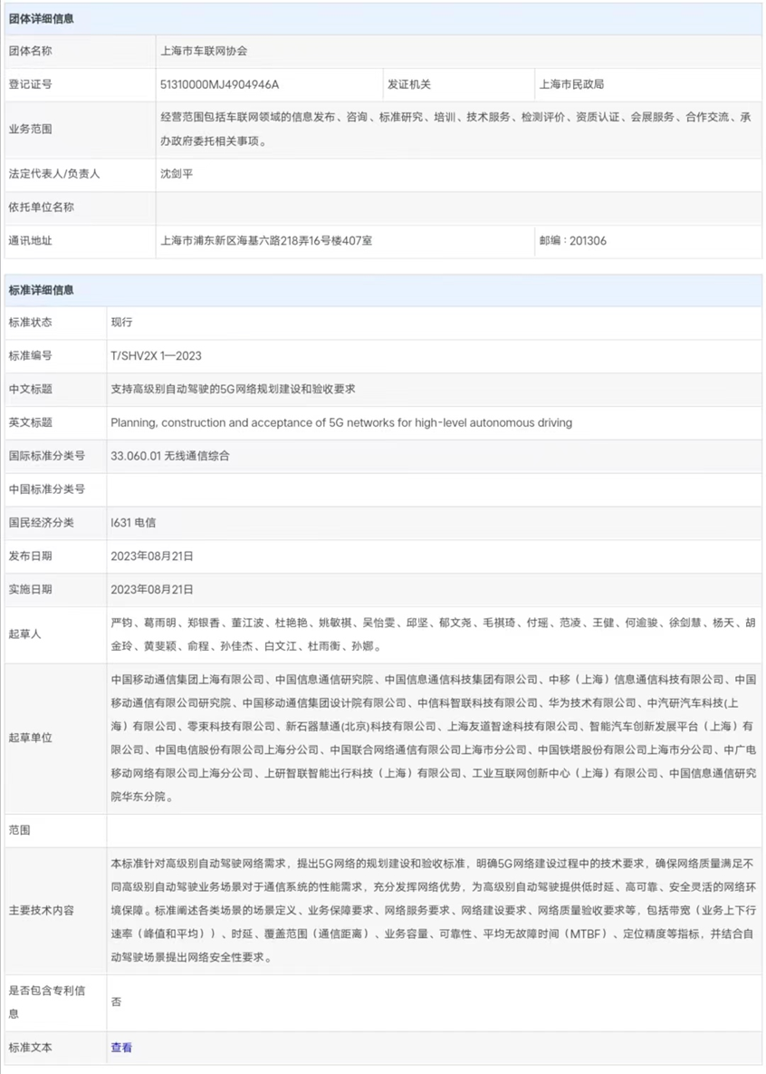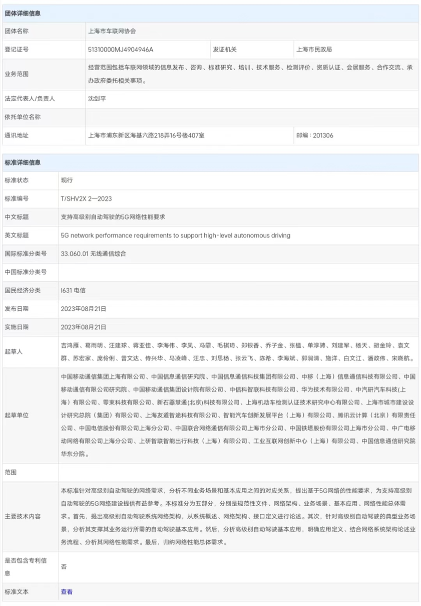 据上海市通信管理局消息,8月21日,在上海市通信管理局的指导下,由上海移动和中国信息通信研究院牵头组织二十余家标准起草单位共同参与编写的《支持高级别自动驾驶的5G网络规划建设和验收要求》和《支持高级别自动驾驶的5G网络性能要求》等两项团体标准正式发布施行。这是国内首部支持高级别自动驾驶的5G网络性能和建设验收标准,填补了国内外相应标准的空白,为上海市智能网联汽车创新应用和产业发展打下了坚实的标准基础。