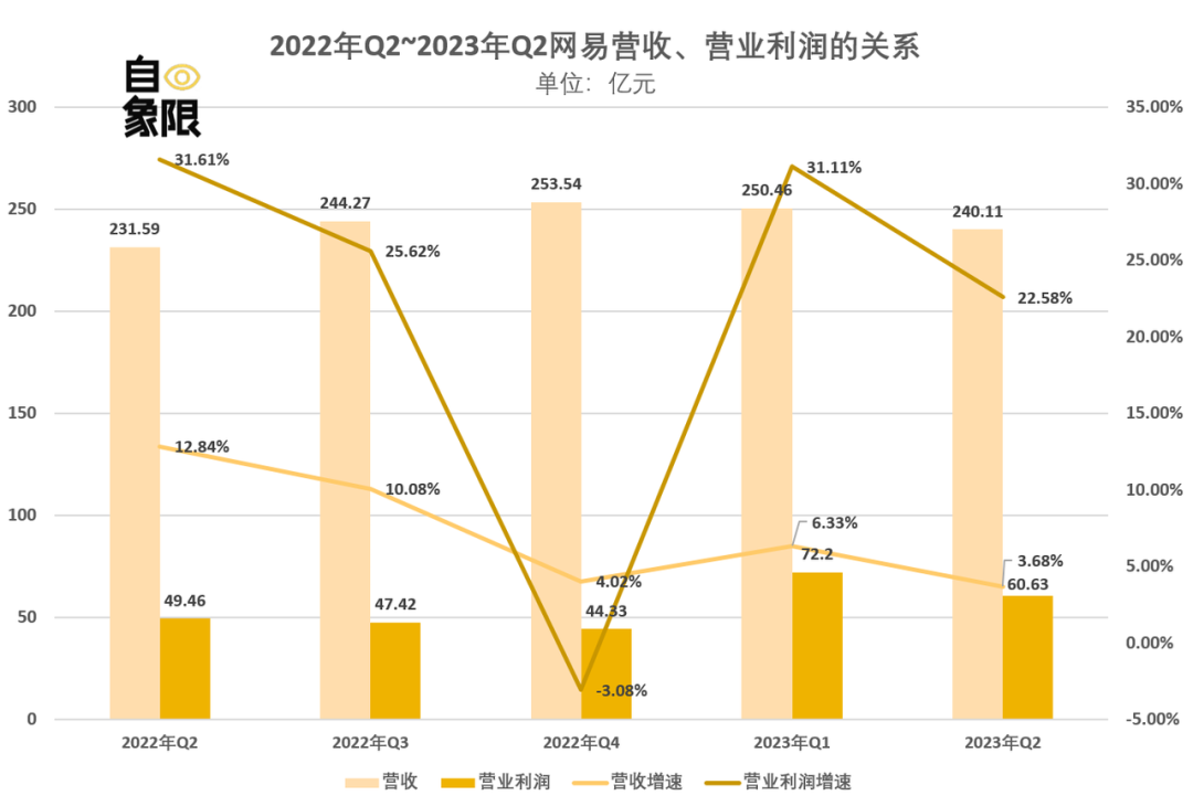 8月24日港股盘后,网易发布2023年二季度财报,营收240.11亿人民币,同比增长3.68%。其中营业利润60.63亿,同比增长22.58%。