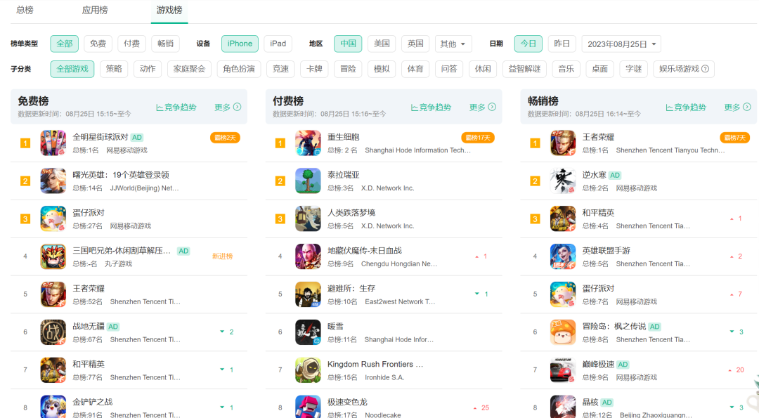 在七麦数据的游戏畅销榜上,排名前20款游戏中网易有6款,分别是排名第2的《逆水寒》、排名第5的《蛋仔派对》,排名第7的《巅峰极速》、排名第10的《全明星街球派对》,排名第13的《梦幻西游》和排名19的《率土之滨》。