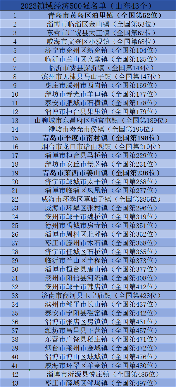 8月22日,赛迪顾问与赛迪工业和信息化研究院联合发布“2023镇域经济500强暨西部50强”,山东共有43个镇上榜,其中青岛有3镇上榜,黄岛区泊里镇位列全国第52位,平度市南村镇位列全国第198位,莱西市姜山镇位列全国第236位。