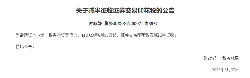 8月27日,财政部、税务总局公告称,为活跃资本市场、提振投资者信心,自2023年8月28日起,证券交易印花税实施减半征收。