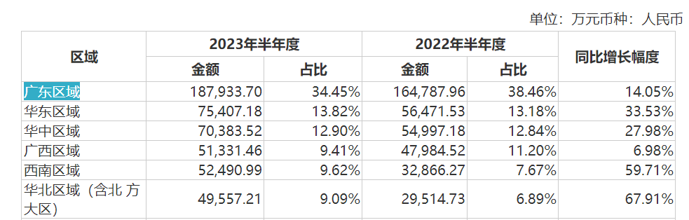 虽然东鹏饮料的“大本营”广东区域贡献了34.45%的主营业务收入,仍然是绝对的销售主力,但增速仅有14.05%,仅高于广西区域的6.98%,明显低于整体营收增速。