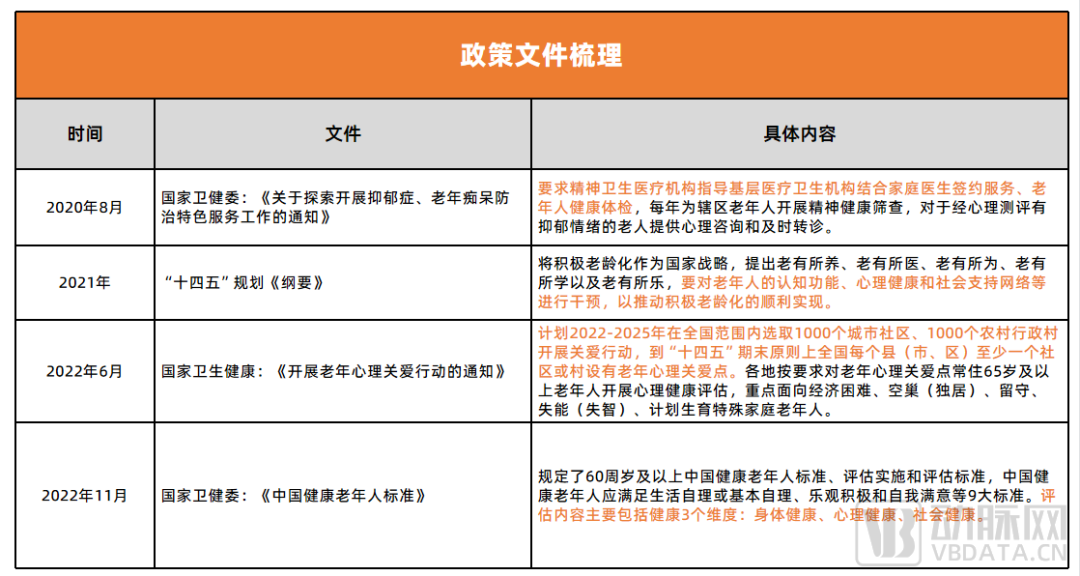 首先从政策上看。2021年,国家把“积极应对老龄化上升为国家战略”,相关的配套政策逐步落地:鼓励关爱老年心理情况,主张提升服务水平,促进基层心理健康网络化服务建设,并将心理健康列入了健康老年人的评判标准。