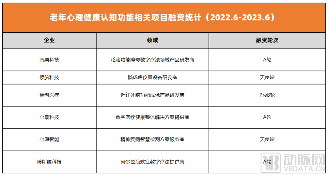 其中,博斯腾科技是长岭资本针对老年认知功能细分领域的布局。根据动脉网统计,过去一年中,国内共有6起相关投资,全部在B轮以下。