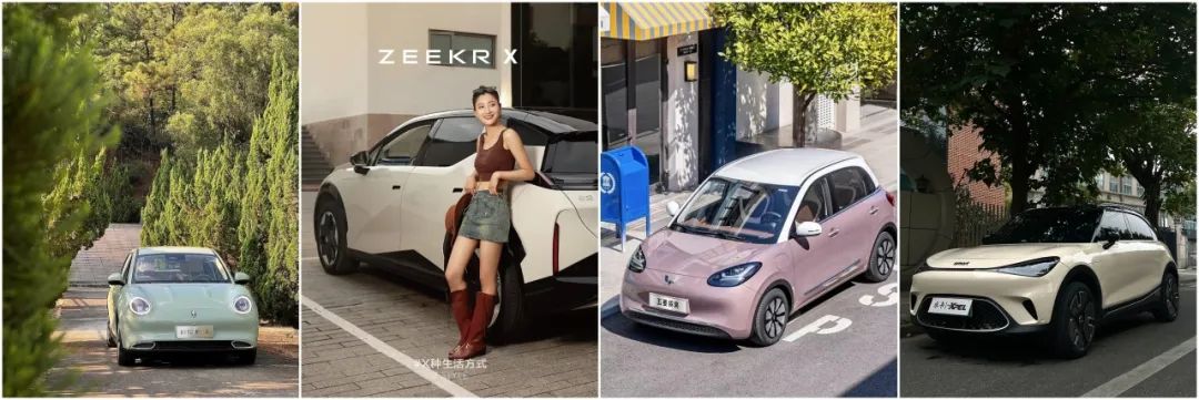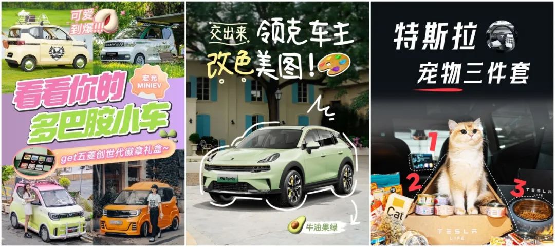五菱、领克、特斯拉、比亚迪官号粉丝都已相继突破 10 万。五菱以高度匹配社交媒体的平价产品和高效的精细化运营著称,从各色联名、敞篷车型到马卡龙配色,可传播性很强;领克主推家庭场景车型和女性化配色,辅以新手教程、联名礼盒、出行体验等内容;至于零投放的特斯拉,一直以来的高关注主要源于品牌自身的话题性。