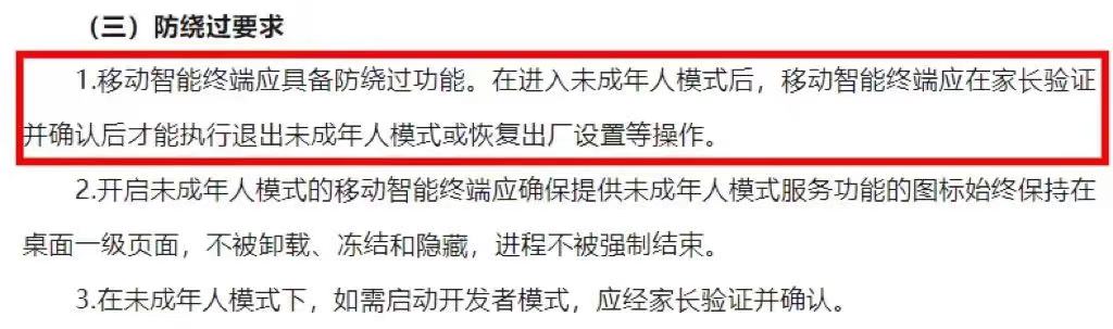 “防绕过”作为游戏行业先行探索的防沉迷重要发力点,此次也出现在了“未成年人模式”的部署中——征求意见稿中专门对移动智能终端提出“防绕过”要求,明确其应在家长验证并确认后才能执行退出未成年人模式或恢复出厂设置等操作,家长可自行选择密码、指纹、人脸等识别方式进行单一或复合验证。