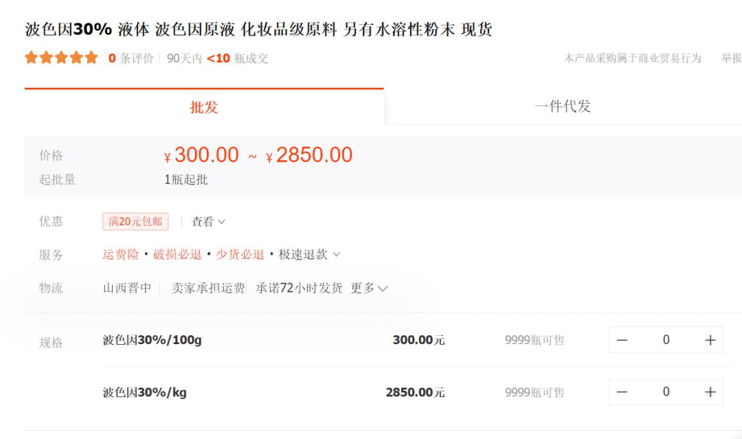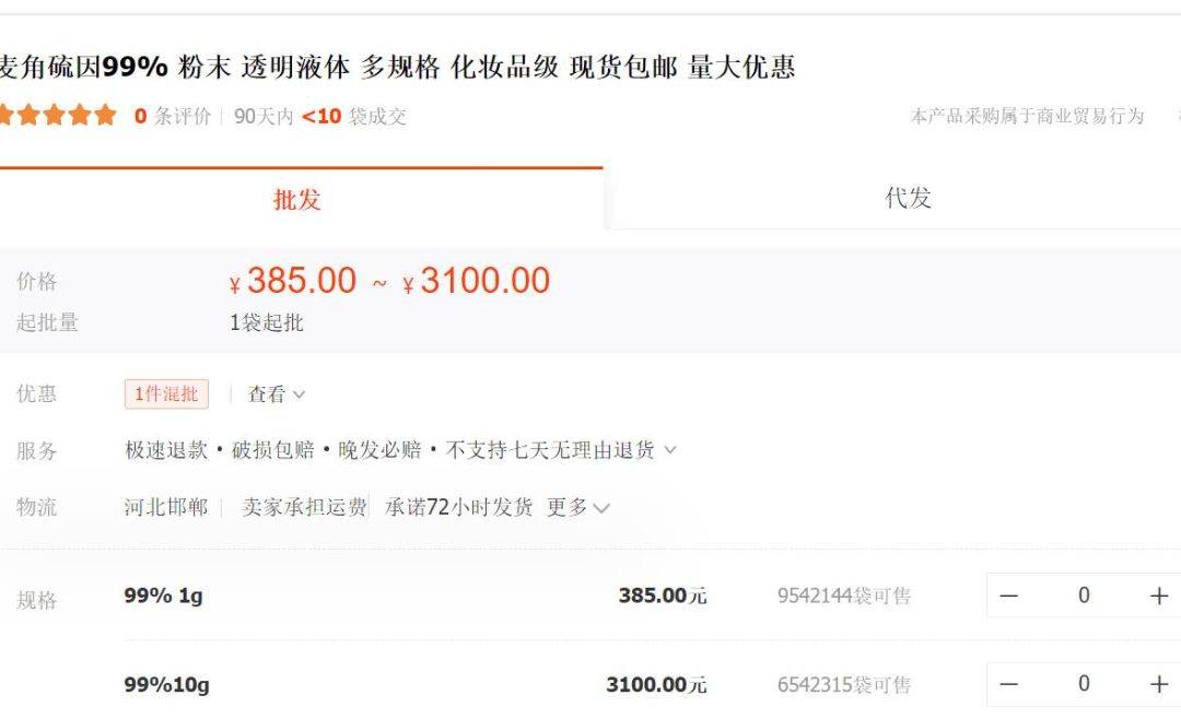 此外,青眼在1688平台查询了解到,30%纯度的玻色因原料价格也普遍在3000元/公斤左右;依克多因则多以99%的纯度为主,售价普遍在5000元/公斤左右,也有部分公司的报价仅为2100元/公斤;麦角硫因也主要以98%和99%的纯度为主,报价范围为4万元至10万元之间。
