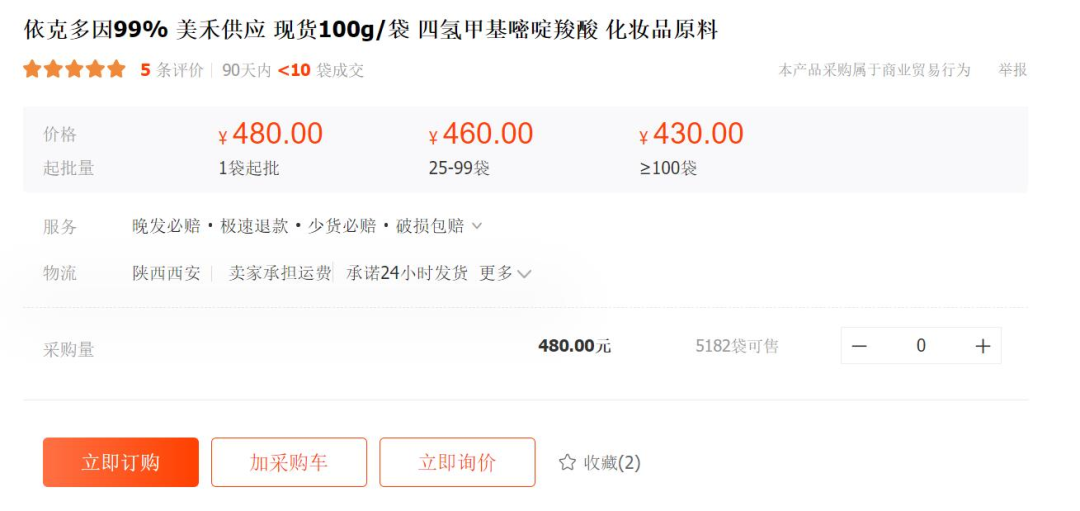 不止是玻色因,依克多因、麦角硫因的国内生产厂家也不在少数。在1688和各大化工交易平台上,青眼发现,有不少来自陕西、深圳、山东、广东等省市的原料公司均售有这2种原料。值得一提的是,近日,江苏仅三生物科技有限公司即向青眼透露,“经过核心团队的科研攻关,公司已率先实现了麦角硫因的cGMP工程化量产,并在麦角硫因的品质、产能、成本方面形成了国际竞争力。”