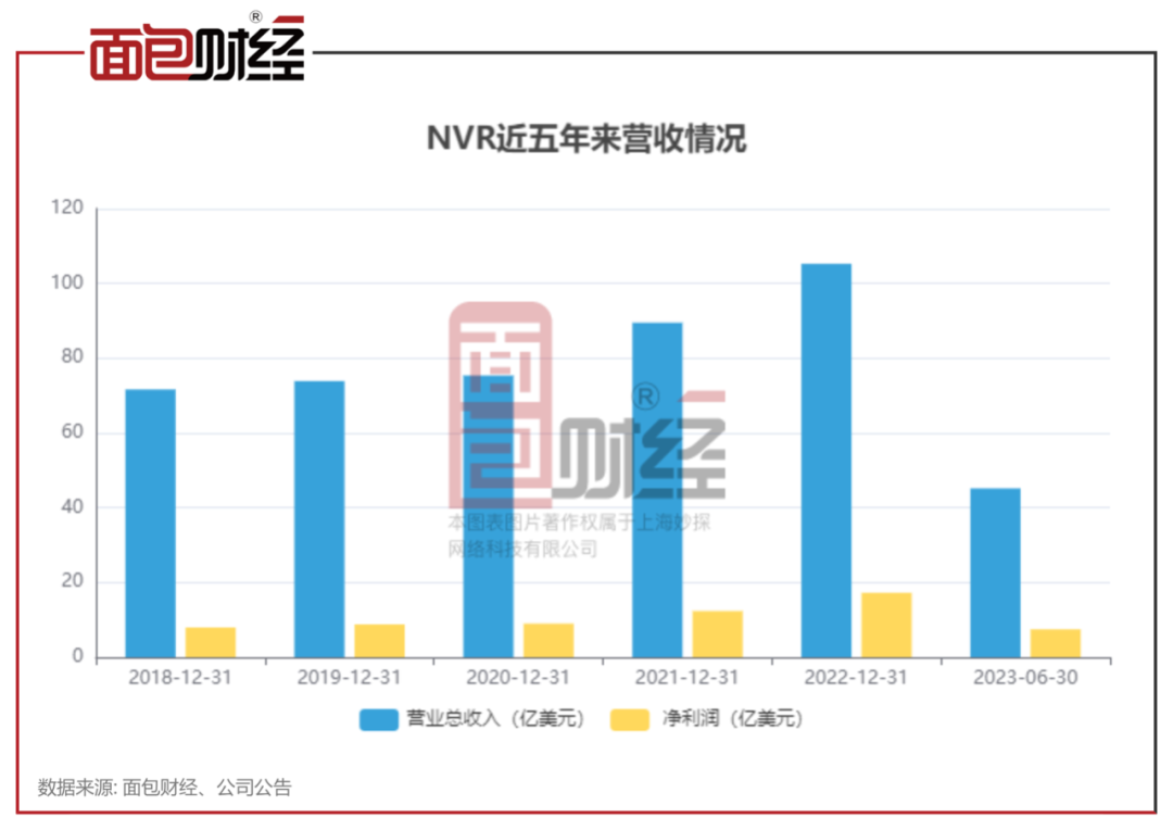 根据最新财报,2023年上半年,NVR营业收入为45.17亿美元,同比下降10.34%;净利润为7.48亿美元,同比降低12.92%。近年来公司业绩首次出现下滑。